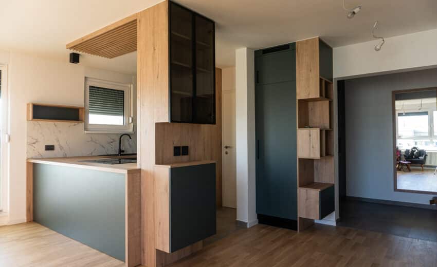 Detalji poput crnih tankih ručkica i elementa sa staklenim vratima u aluminijskom profilu unose dašak elegancije i povezuju sve linije u prostoru.
