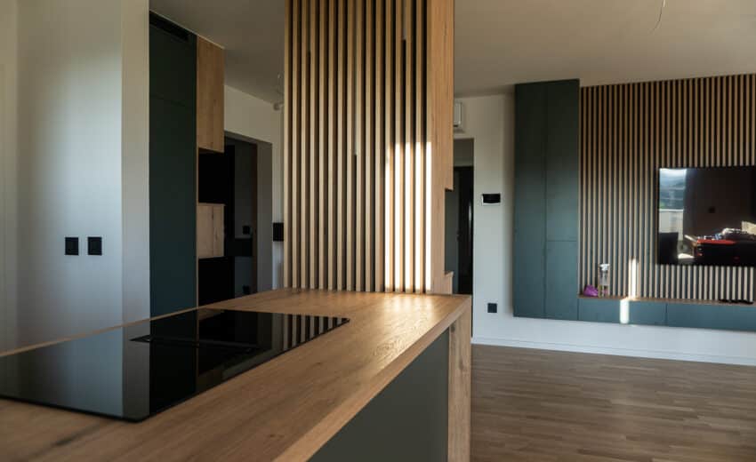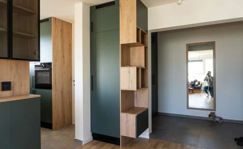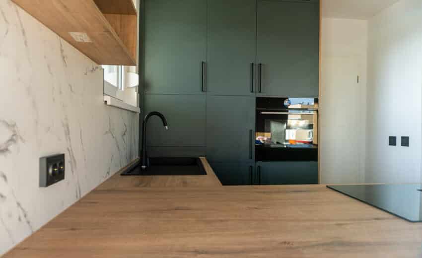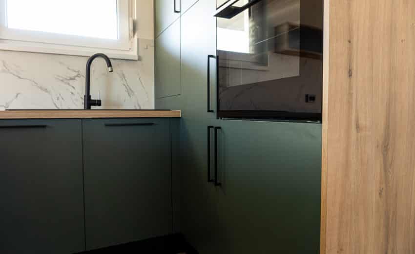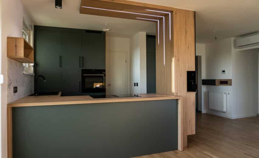 Kuhinja po mjeri dizajnirana je u dekoru Hrast Davenport H3359 i U665 tamno zelenoj boji, stvarajući toplu i suvremenu kombinaciju prirodnih i tamnih tonova. Poseban estetski doživljaj pružaju dekorativne letvice u L obliku s integriranom LED rasvjetom, koja osigurava dodatnu svjetlost radnoj površini.