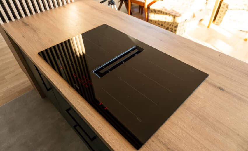 Za dugotrajnu funkcionalnost korišten je BLUM okov i BLUM Antaro ladice s tihim zatvaranjem, dok je ugrađena Bosch indukcijska ploča s integriranom napom — moderno i praktično rješenje koje eliminira potrebu za klasičnom napom.