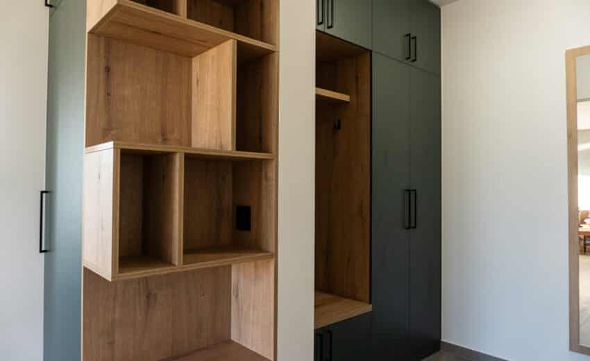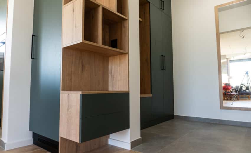 Na samom ulazu nalazi se kutija s letvicama koja vizualno obogaćuje prostor, a ujedno služi kao praktično mjesto za odlaganje ključeva i sitnica koje svakodnevno koristimo. Dodatne dekorativne police omogućuju izlaganje manjih predmeta poput vaza, knjiga ili ukrasa, čime se prostor dodatno personalizira i oplemenjuje.